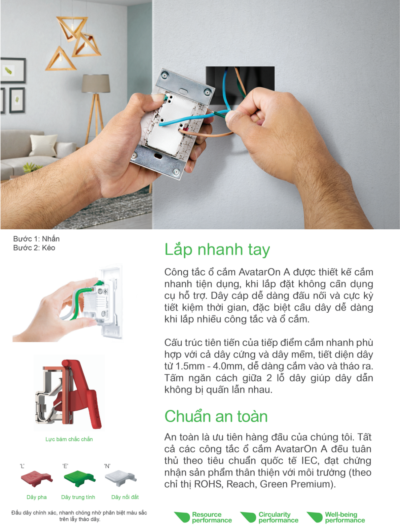 Lắp nhanh tay: Công tắc ổ cắm AvatarOn A được thiết kế cắm nhanh tiện dụng, khi lắp đặt không cần dụng cụ hỗ trợ. Dây cáp dễ dàng đấu nối và tiết kiệm thời gian, đặc biệt cầu dây dễ dàng khi lắp nhiều công tắc và ổ cắm