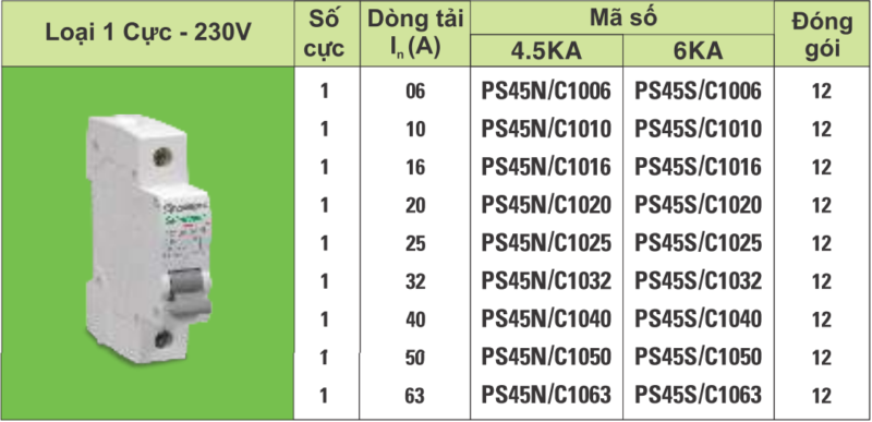 Cầu dao tự động Sino Vanlock MCB 1P 4.5kA PS45N bảo vệ mạch điện chống quá tải và ngắn mạch, chế tạo theo tiêu chuẩn IEC60898, dòng định mức từ 6 – 63A, đặt tính ngắt loại C, sản phẩm của Vanlock, thiết bị điện công nghiệp